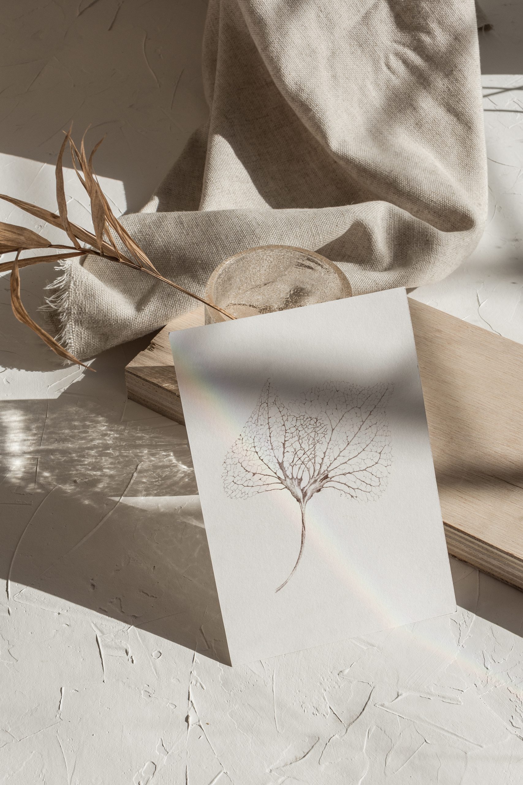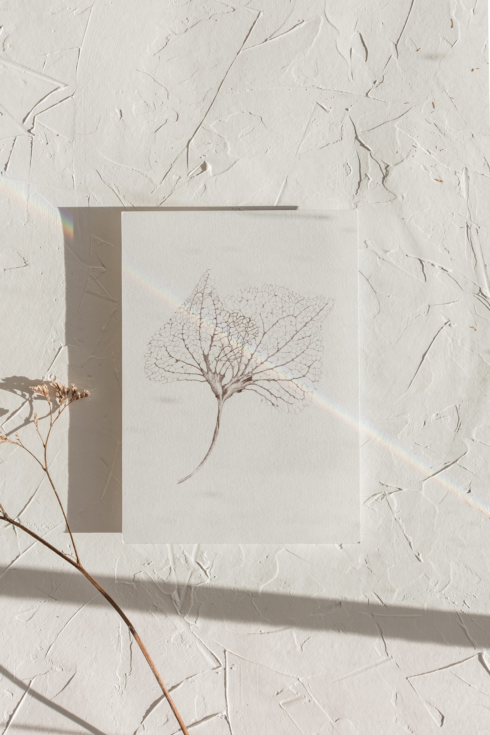 Vier afbeeldingen gekocht; het ginkgoblad, de esdoornzaden en de twee hortensia’s.