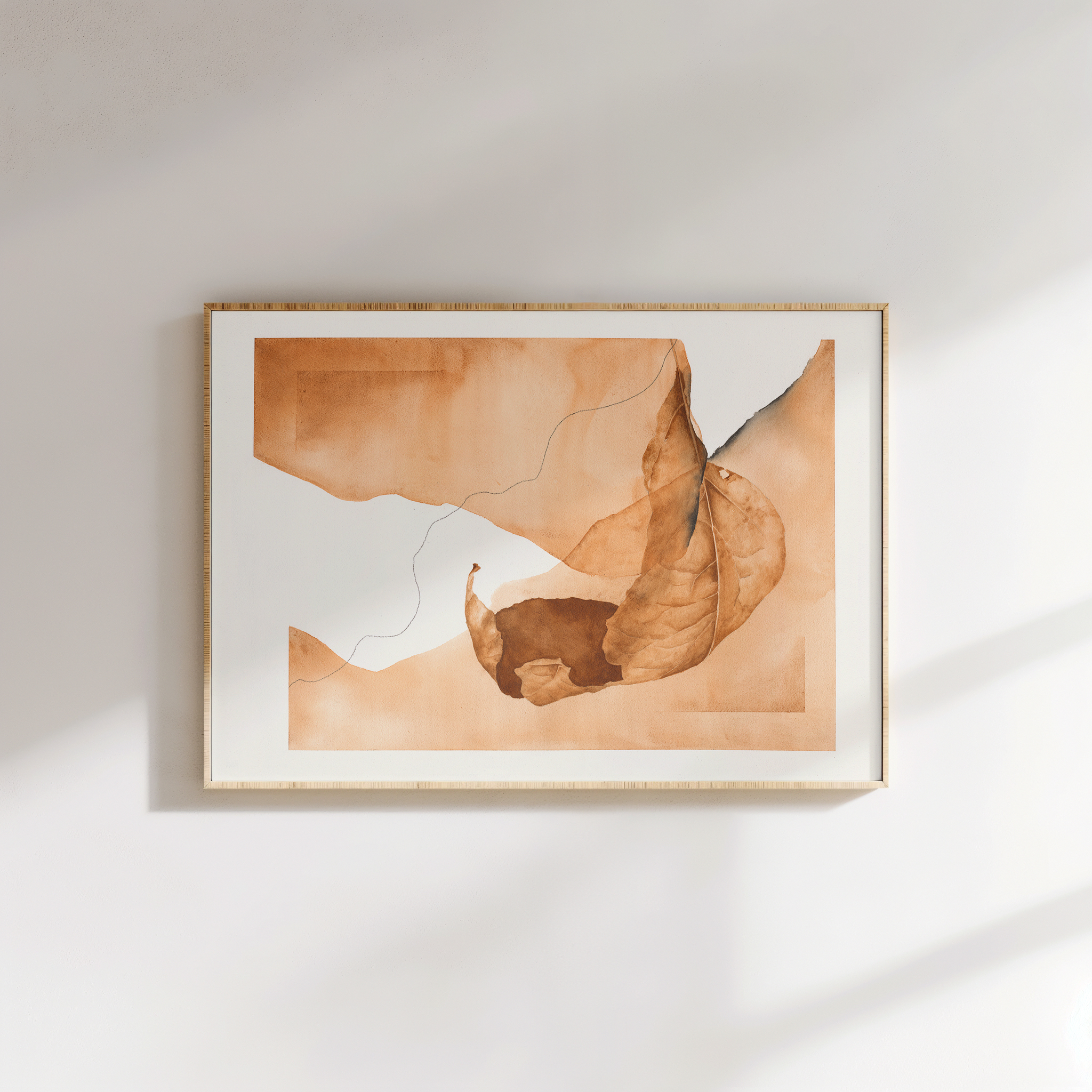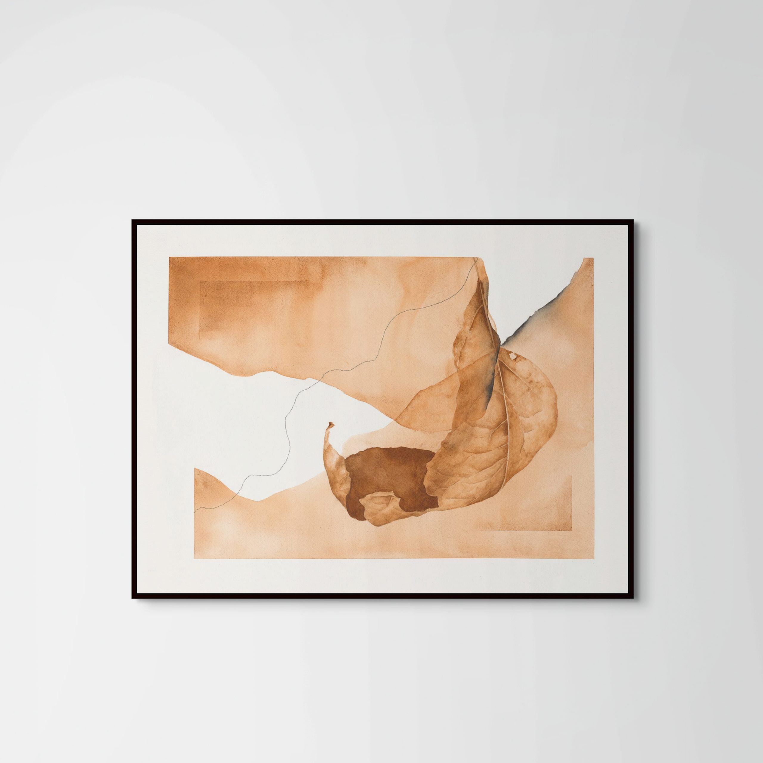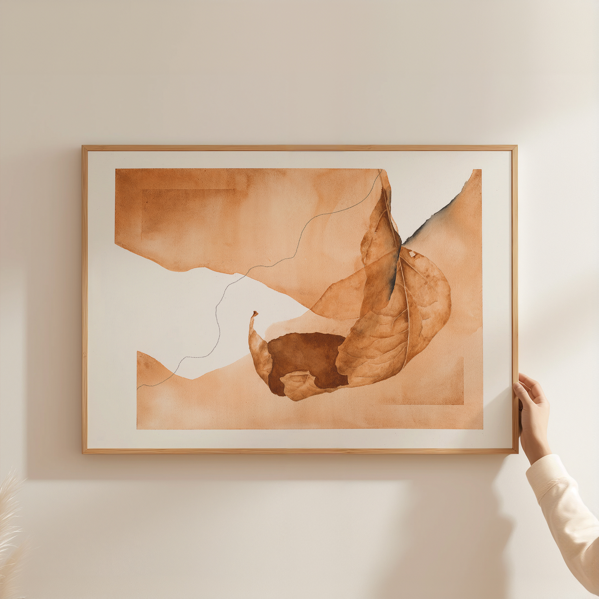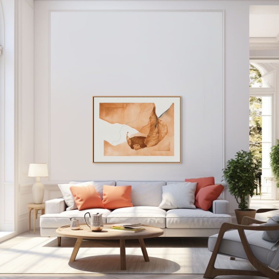 Geschilderd met zelfgemaakte aquarelverf van aardepigmenten, straalt dit werk een gevoel van rust en verfijning uit. De warme, aardse tinten zorgen voor een uitnodigende en ontspannen sfeer, perfect voor een modern interieur.